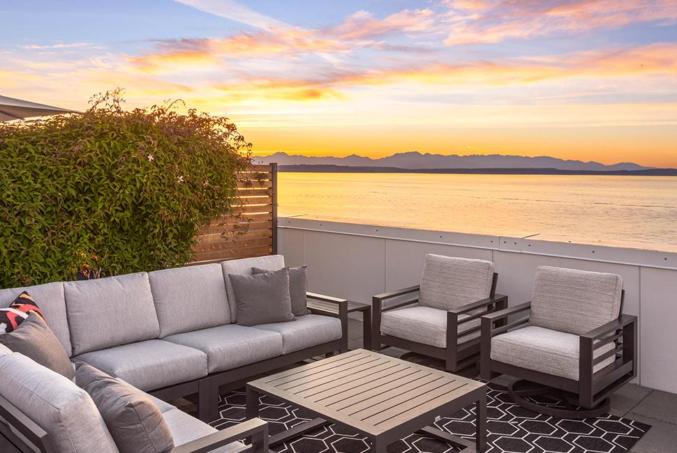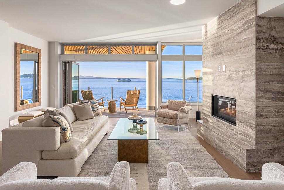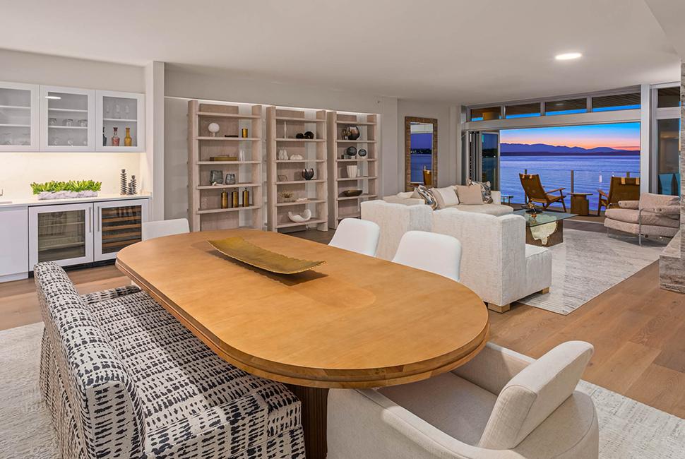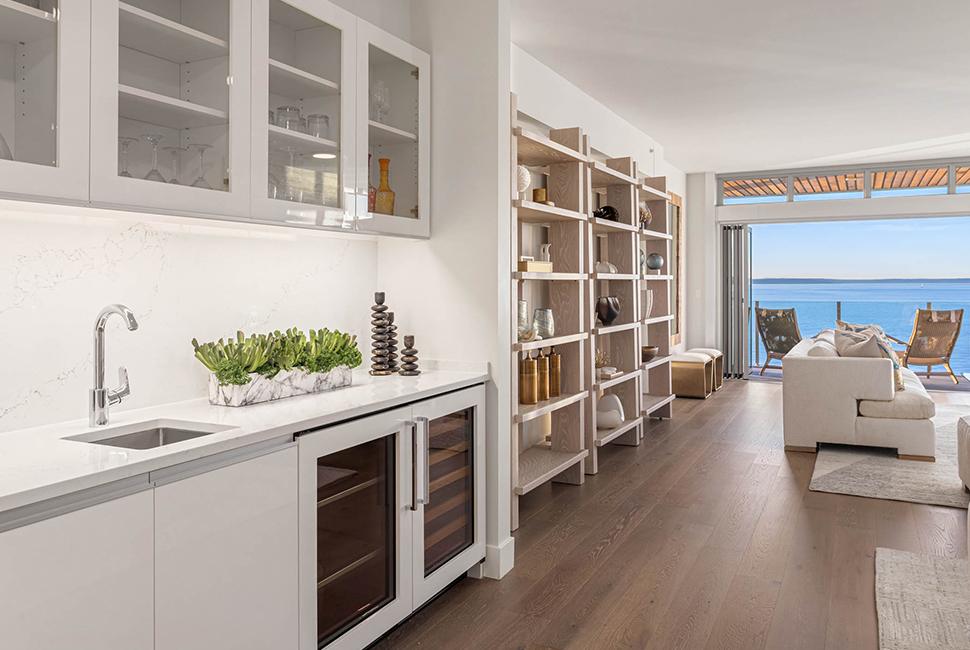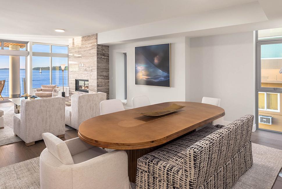 Urban Interiors furnished this penthouse at the Infinity Shore Club Residences with clean-lined pieces, layered textures, and thoughtfully styled accessories to enhance its panoramic waterfront setting.